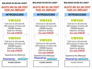 The document introduces two new prepaid mobile plans, VM300 and VM500. VM300 offers unlimited texting to all networks, 240 minutes of calls to other networks, 100MB of internet, valid for 30 days for P300. VM500 offers the same features but with 420 minutes of calls and 200MB of internet, valid for 60 days for P500. It encourages contacting the provider to experience the difference of these new plans.