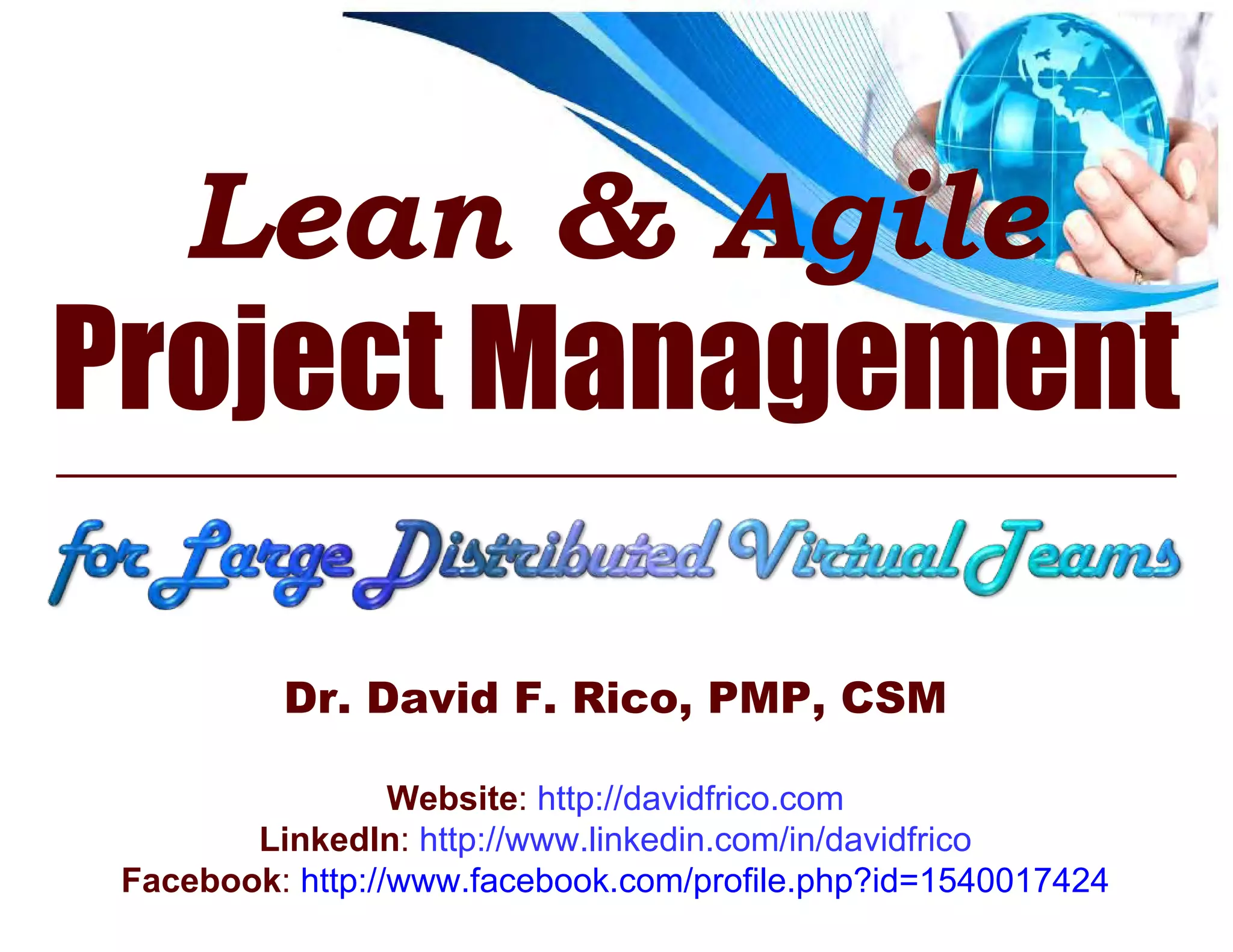 Dr. David F. Rico is an expert in lean and agile project management with over 28 years of experience working on large government IT projects around the world. He has authored several books and articles on agile program management and lean development practices. The document discusses key concepts of agility, agile project management, how lean and agile intersect, a lean and agile project management model, virtual teams, advantages and pitfalls of virtual teams, and varieties of virtual team structures.