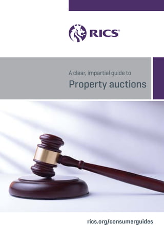 This document is a comprehensive guide to property auctions, detailing the processes and advantages for both buyers and sellers. It emphasizes the importance of working with RICS members for impartial advice and guidance while outlining steps for successful bidding and selling, including legal requirements and auction day procedures. The guide also provides resources and contact information for further assistance with property auctions.