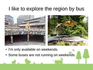 The document discusses an app called "Ride On Today" that allows users to check which bus routes are running on a selected date. It imports bus schedule data in GTFS format into a SQLite database to determine which "services" and bus "trips" are active on the chosen date. The stops served by those trips are then plotted on an interactive map to show users the available bus stops and routes for that day. Future work may include automatic schedule updates, support for additional transit agencies, and interactive trip planning features.