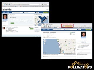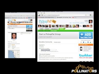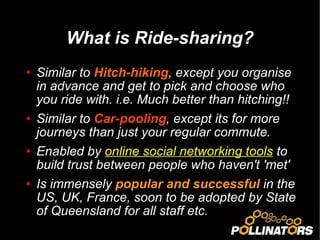 The document discusses ride-sharing in Geraldton as a pre-organized alternative to hitch-hiking and carpooling, enabled by social networking tools. It highlights the benefits of ride-sharing, including cost savings and environmental impact, and compares three platforms: Liftshare, Zimride, and Pickuppal. The document concludes with next steps for promoting and expanding the ride-sharing community, including poll results, media publicity, and collaboration with local businesses and government.