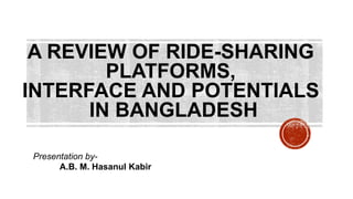 The document reviews ride-sharing platforms in Bangladesh, highlighting their impact on sustainable transport, market opportunities, and employment creation while addressing challenges like unprofessional drivers and inconsistent fare structures. It discusses the legal framework, including government regulations and tax issues, and the growth in ride-sharing services since the pandemic. Future success relies on improving service quality, addressing regulatory hurdles, and expanding reach to other cities.