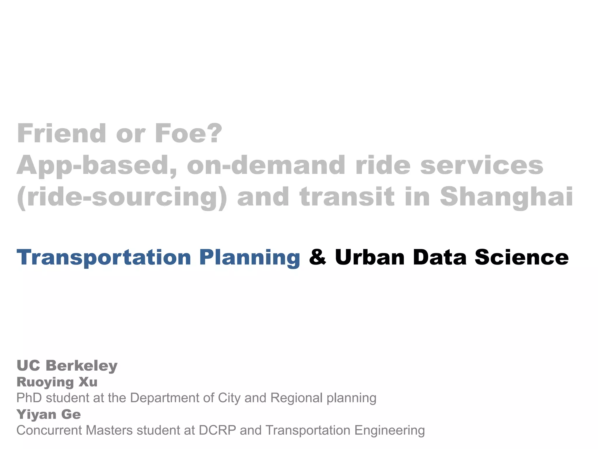 The document analyzes the competition between on-demand ride-sourcing services and traditional transit in Shanghai, exploring factors such as trip distance, availability of transit alternatives, and travel behaviors. It highlights how ride-sourcing services are likely to compete more effectively with transit for longer trips and when metro alternatives are available. Additionally, the findings emphasize the need for responsive transportation planning that considers data-driven insights and the effects of pricing on ride-sourcing demand.