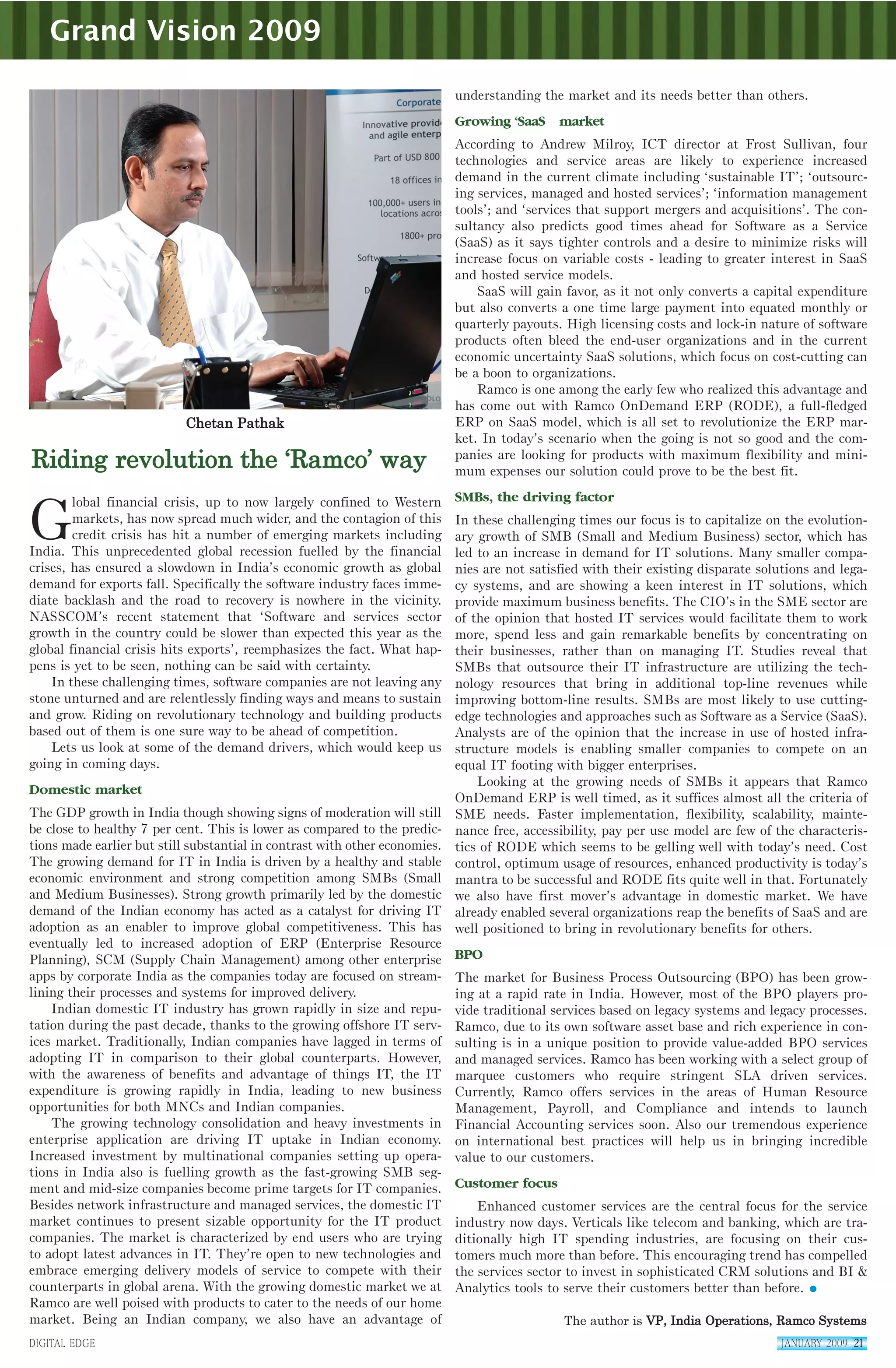 This document discusses the growth of Software as a Service (SaaS) and how Ramco's new SaaS product, Ramco OnDemand ERP (RODE), is well-positioned to take advantage of this growth. It notes that SaaS allows companies to convert capital expenditures to monthly/quarterly payments, improving flexibility. It also discusses how RODE meets the needs of small/medium businesses seeking more flexible, affordable IT solutions. The document argues that RODE and Ramco are well-positioned for success in India's growing domestic market.