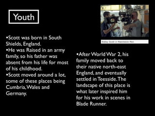 Ridley Scott is an English film director known for his distinctive visual style. He was born in South Shields, England and moved around frequently as a child due to his father's career in the army. Scott began his career making television commercials and short films in the UK. His first major film was 1977's The Duellists. Scott is renowned for his films such as Alien, Blade Runner, Thelma & Louise, and Gladiator. He is known for his strong visual style, extensive storyboarding, and use of landscape and atmosphere to enhance his storytelling.