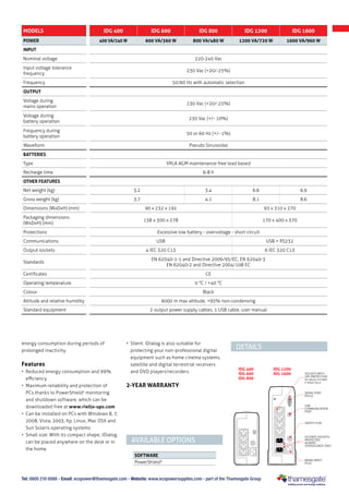 The document summarizes an uninterruptible power supply (UPS) product line called iDialog that provides protection for computers and small electronics. It has a compact, silent design and features automatic voltage regulation, communications software for safe shutdown, and auto-restart. Models range from 400VA to 1600VA and include outlets, USB ports, and filtering to protect connected devices from power issues.