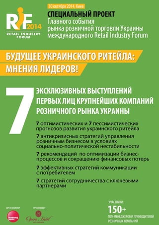 Форум розничной торговли 2014 года — ключевое мероприятие для украинского ритейла, объединяющее руководителей и менеджеров различных секторов торговли. Участники смогут узнать об актуальных тенденциях, антикризисных мерах и стратегиях развития от ведущих специалистов отрасли в рамках семи эксклюзивных выступлений. Форум также предлагает возможность для нетворкинга и обсуждения будущего ритейла в Украине.