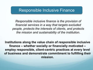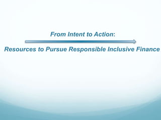 This document discusses resources for responsible inclusive finance, which aims to provide financial services that target excluded people, protect client interests, and ensure institutional sustainability. It outlines key initiatives like the Smart Campaign, which promotes client protection principles, and the Social Performance Task Force, which developed the Universal Standards for Social Performance Management. The Standards provide a framework for institutions to define and monitor social goals, ensure products meet client needs, and balance social and financial objectives. The document recommends learning about these resources, assessing performance, planning improvements, implementing changes, and demonstrating progress through reporting to initiatives like MIX.