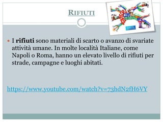 Il documento discute la problematica dei rifiuti in Italia, con particolare riferimento a Napoli e Roma, evidenziando l'alto livello di rifiuti nelle strade e nelle campagne. Viene menzionata la 'Terra dei Fuochi', un'area di 1076 km² con 57 comuni e 2,5 milioni di abitanti, e l'importanza della raccolta differenziata per migliorare l'ambiente. Infine, si fa riferimento ai rifiuti tossici e ai loro effetti nocivi sull'ambiente e sulla salute umana.