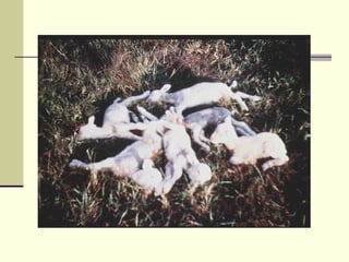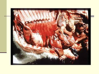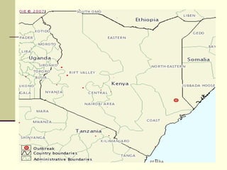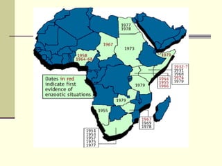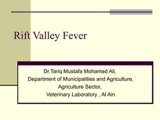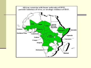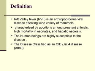 Rift Valley fever is an arthropod-borne viral disease that affects various mammals. It is characterized by abortions in pregnant animals and liver damage. The disease was first described in Kenya in 1931. It is endemic in many African and Middle Eastern countries. Transmission occurs via mosquito bites or contact with infected animal tissues. Symptoms in animals include fever, vomiting, and abortions. The virus can be diagnosed by isolating it from blood or tissues of infected hosts. Controlling mosquito populations and vaccinating susceptible animal species are important for prevention.