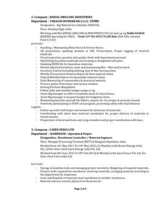 Dharmendra Chauhan has over 8 years of experience in materials management and procurement. He is currently working as a Rig Material Coordinator for Jindal Drilling Industries in UAE, where he is responsible for maintaining inventory, procuring materials, and coordinating with vendors and shipyards. Previously, he has worked for Cairn India and Abbott India in roles involving warehouse management, inventory control, procurement, and logistics. He holds a diploma in Material Management and is proficient in SAP and Microsoft Office applications.