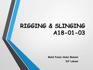Lifting of heavy objects requires proper rigging techniques and equipment to prevent accidents. Correct rigging uses slings, ropes, chains, hooks, shackles and other tools to securely lift and move loads. Regular inspection of all rigging components is important, as wear and defects can compromise safety if not addressed. Proper slinging techniques like choker and basket hitches are necessary to control loads. Calculations must ensure rigging gear is not overloaded.