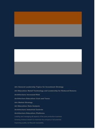 The document discusses various topics related to investment strategy, leadership, and business improvement including general leadership topics, retail technology, increased risk, cost and taxes, market strategy, data analysis, industrial controls, platforms, leading post production business, growing revenue streams, improving quality and predictability, and reducing costs.