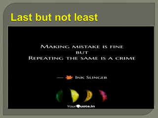 The document discusses the concepts of mistakes, errors, faults, and blunders, emphasizing their definitions, implications, and differences. It highlights the importance of a 'right first time' culture in the workplace, advocating for proper training, personal responsibility, and systematic analysis to minimize errors. Additionally, it introduces concepts like Poka Yoke and Total Quality Management as strategies for preventing mistakes and ensuring quality.