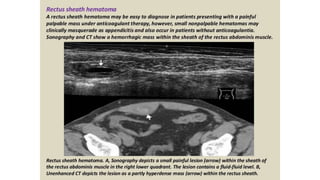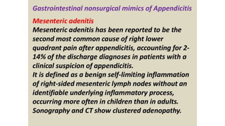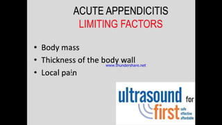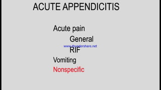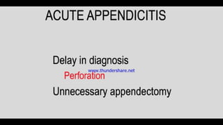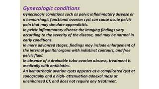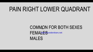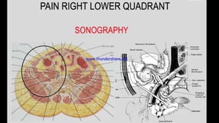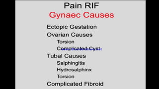 This document discusses the evaluation of right lower abdominal pain and lists appendicitis as a key cause. It notes that other potential causes include hemorrhagic cysts, heterotrophic pregnancy, salpingitis with pyosalpinx, funiculitis, and torsion of an undescended testis. The document was presented by Dr. A.S.M. Sufian of Cumilla Medical College Hospital and thanks the audience for their patience and listening.