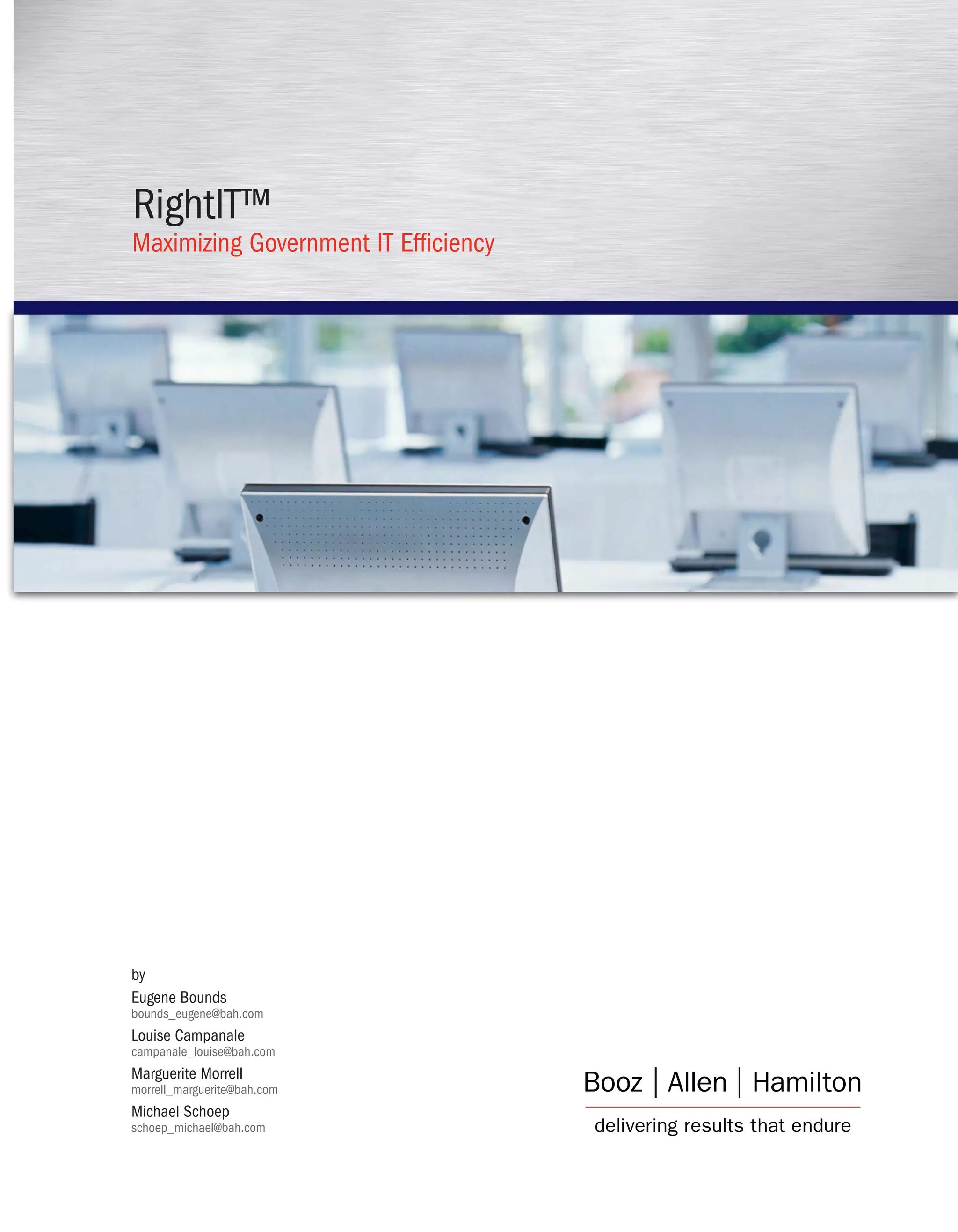 The document discusses Booz Allen Hamilton's RightITM methodology aimed at maximizing government IT efficiency amid budget cuts and the need for comprehensive spending control. It highlights various inefficiencies in the current federal IT environment, such as fragmented management and hidden costs, and presents case studies demonstrating the effectiveness of their approach in improving IT performance and achieving cost savings. The methodology involves a three-phased process including diagnostics, planning, and implementation to optimize IT operations and ensure compliance with federal mandates.