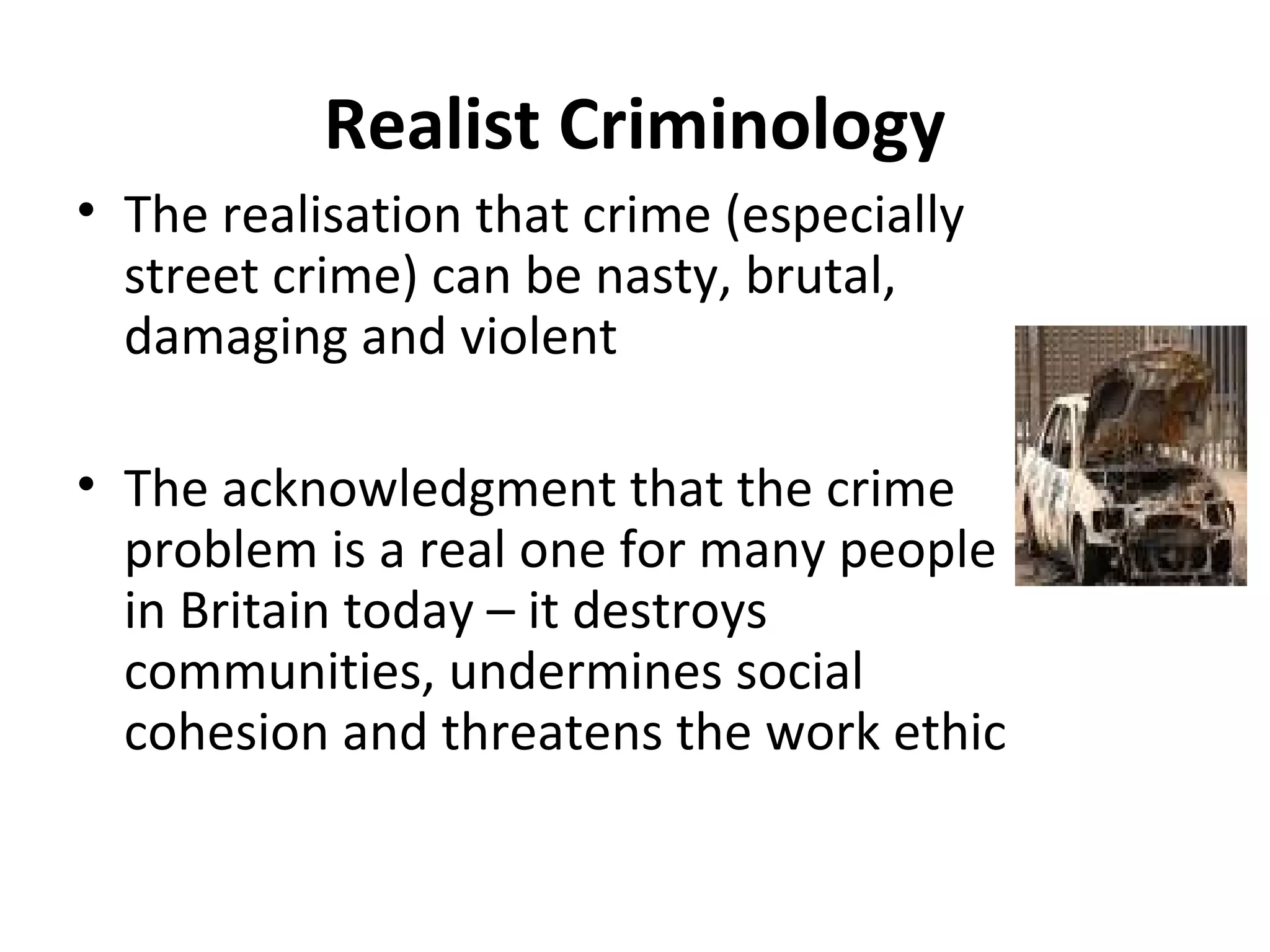 Right Realism seeks practical crime control measures rather than finding the causes of crime. It acknowledges crime is a real problem that destroys communities. Right Realists argue crime results from biological differences, faulty socialization leading to an underclass, and rational choice. They propose preventing crime through proactive policing, broken windows policy, strong communities, target hardening, and deterring crime through certainty of punishment like imprisonment. The goal is controlling crime rather than solving its root causes.