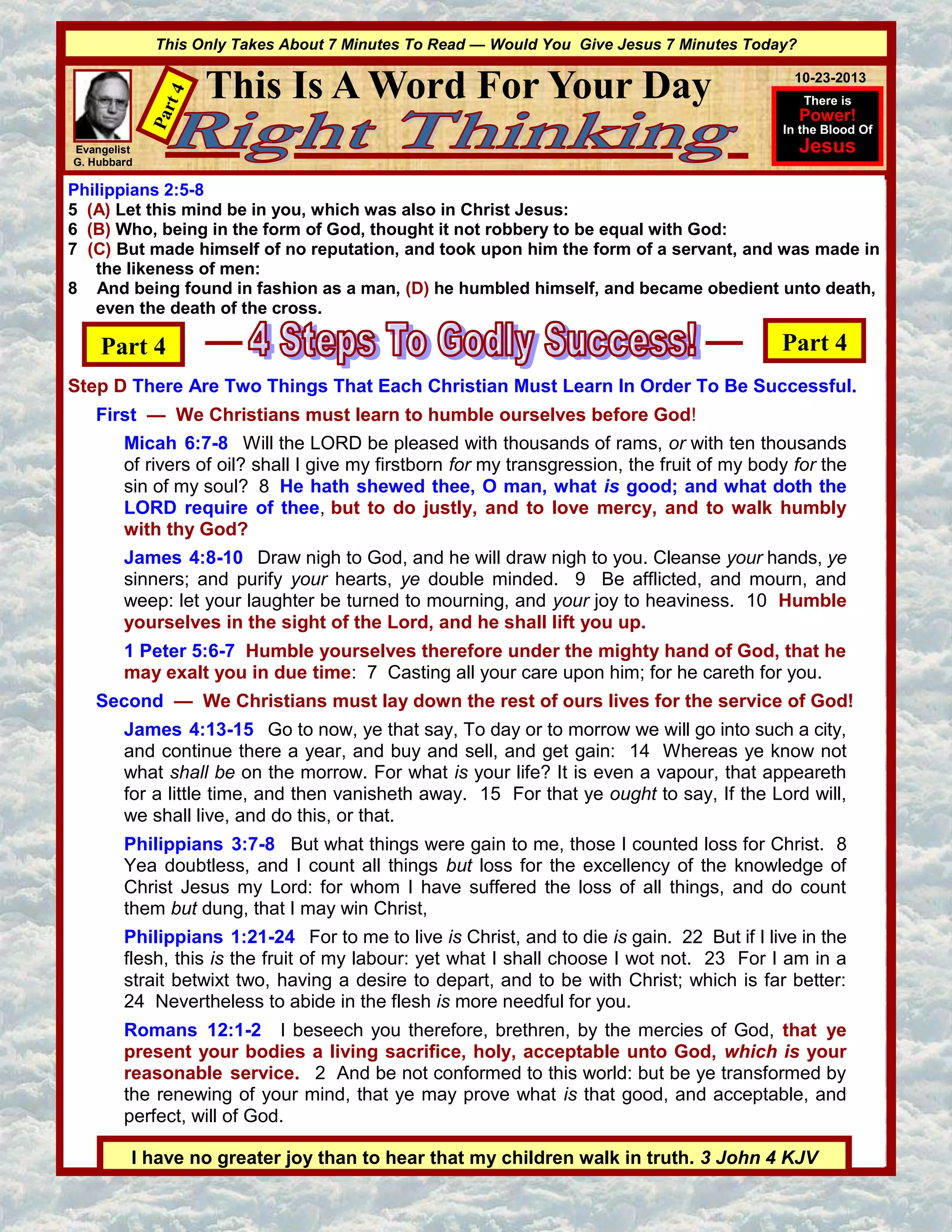 This document is a multi-part message about humbling oneself before God and dedicating one's life to his service. It contains several Bible verses exhorting believers to humble themselves under God's hand and draw near to him. It also includes passages encouraging Christians to forsake all things for Christ and present their bodies as living sacrifices to God rather than conforming to worldly desires. The overall message is that to be successful in faith, one must learn humility before God and commit fully to laying down their life in service to him.