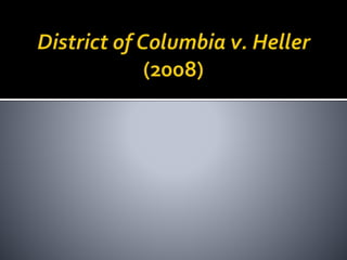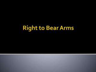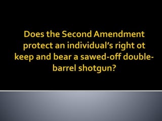 The document discusses a Supreme Court case regarding the Second Amendment and the right to bear arms. In a 5-4 decision, the Court ruled that the Second Amendment protects an individual's right to possess a firearm for traditionally lawful purposes such as self-defense within the home. However, the government may still limit "dangerous and unusual weapons" that do not have reasonable relationships to the preservation of a well-regulated militia, such as sawed-off shotguns. The ruling affirmed that the core right protected by the Second Amendment is for law-abiding citizens to use arms in defense of hearth and home.