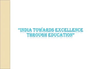 The document discusses the right to education and major initiatives in India to promote education. It highlights that education is a tool for empowerment and promoting individual freedom. It outlines key principles of availability, accessibility, adaptability and acceptability of education. It also provides statistics on literacy rates in India and challenges in the education system like dropouts, illiteracy among adults and women, lack of vocational skills, corruption and inadequate resources.