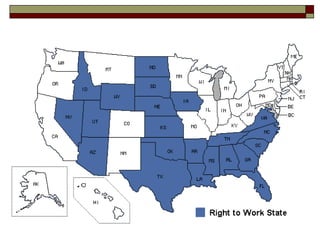 The document critiques 'right-to-work' laws, arguing they undermine unions and lower wages without delivering promised economic benefits. It contends that such laws are outdated and based on myths, emphasizing that they do not play a significant role in business location decisions or improving worker buying power. Rather than fostering growth, right-to-work laws create a negative impact on workers' incomes and overall economic health.