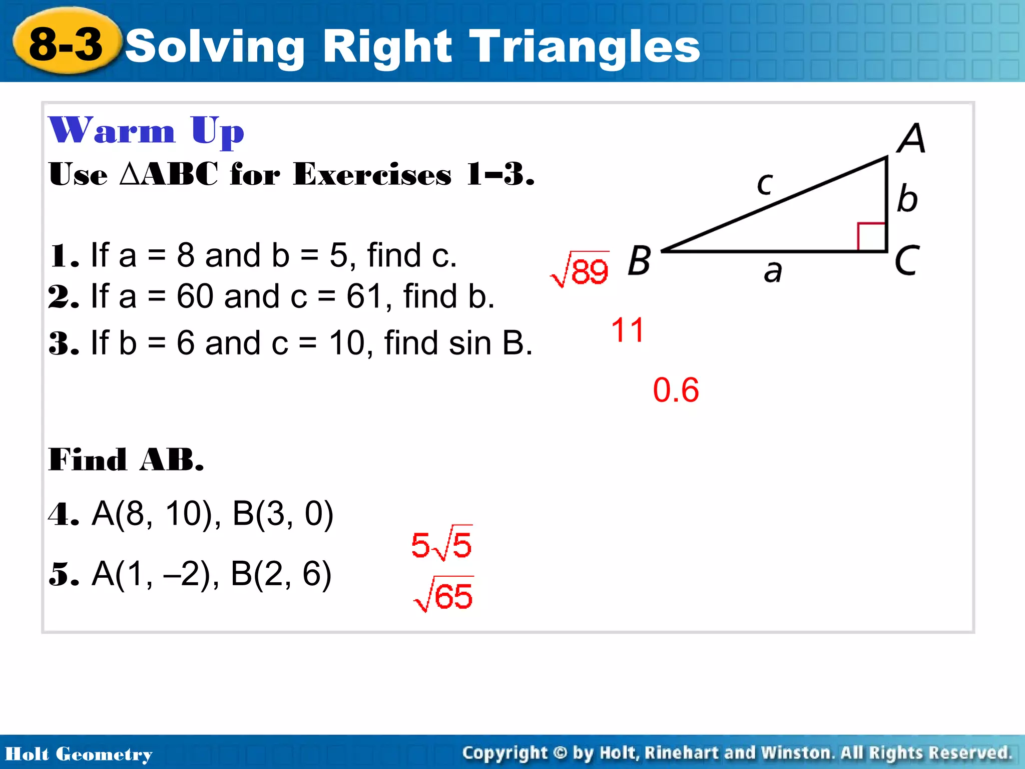 This document provides instruction on solving right triangles using trigonometric ratios. It includes examples of identifying angles from trigonometric ratios, calculating angle measures from ratios using inverse functions, solving right triangles when given side lengths or an angle measure, solving triangles in the coordinate plane, and applying trigonometry to problems involving road grades. Students are guided through applying concepts to multiple examples and practice problems.