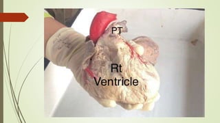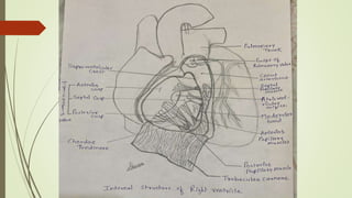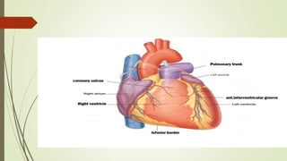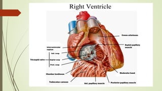 The document discusses the anatomy and function of the right ventricle of the heart, detailing its structure, including the inflowing and outflowing parts, and features such as trabeculae carneae and papillary muscles. It describes the interventricular septum and clinical conditions related to the right ventricle, like right ventricular hypertrophy and ventricular septal defect. The right ventricle's role in receiving deoxygenated blood and its connections to the pulmonary trunk are also highlighted.