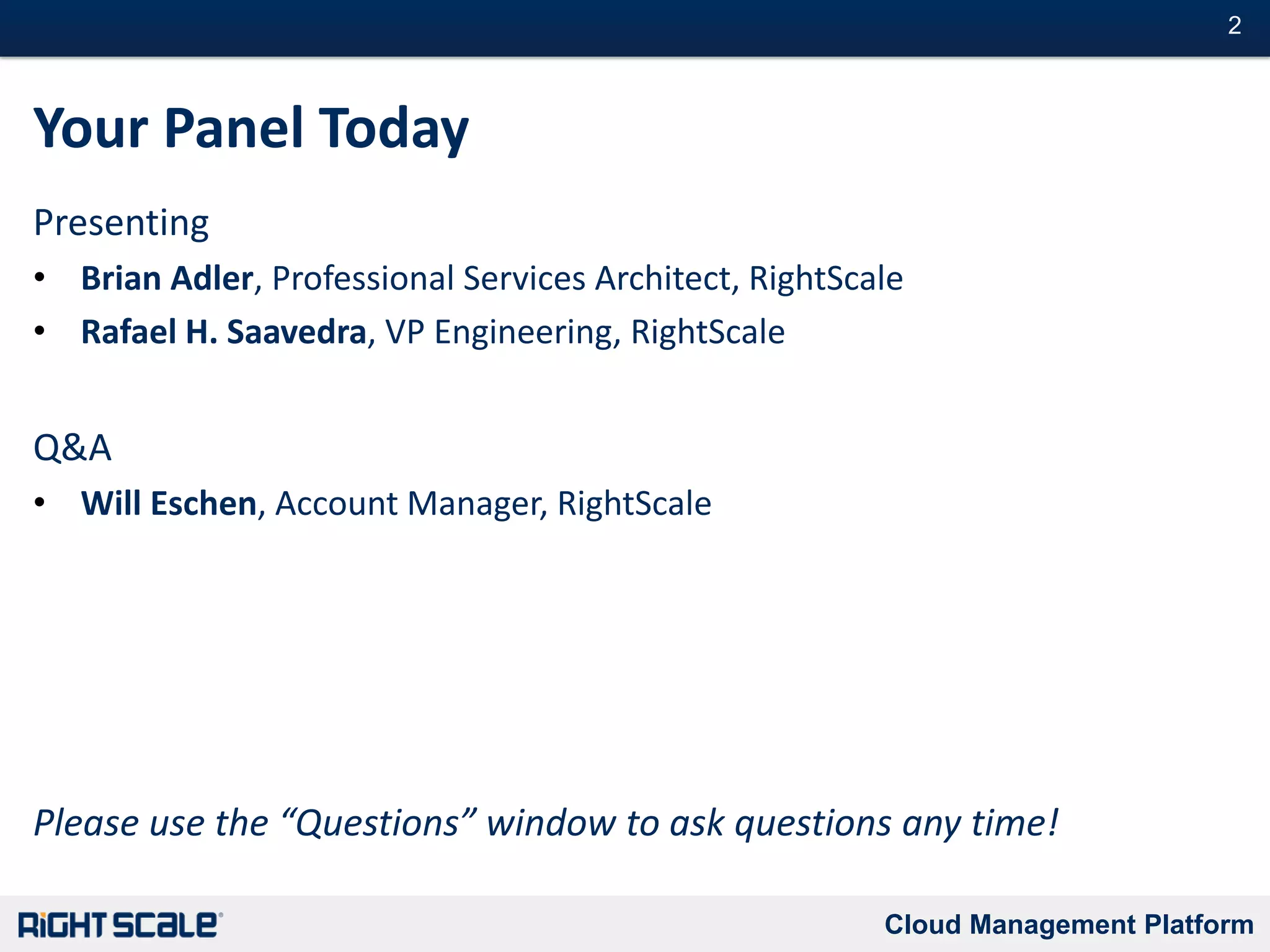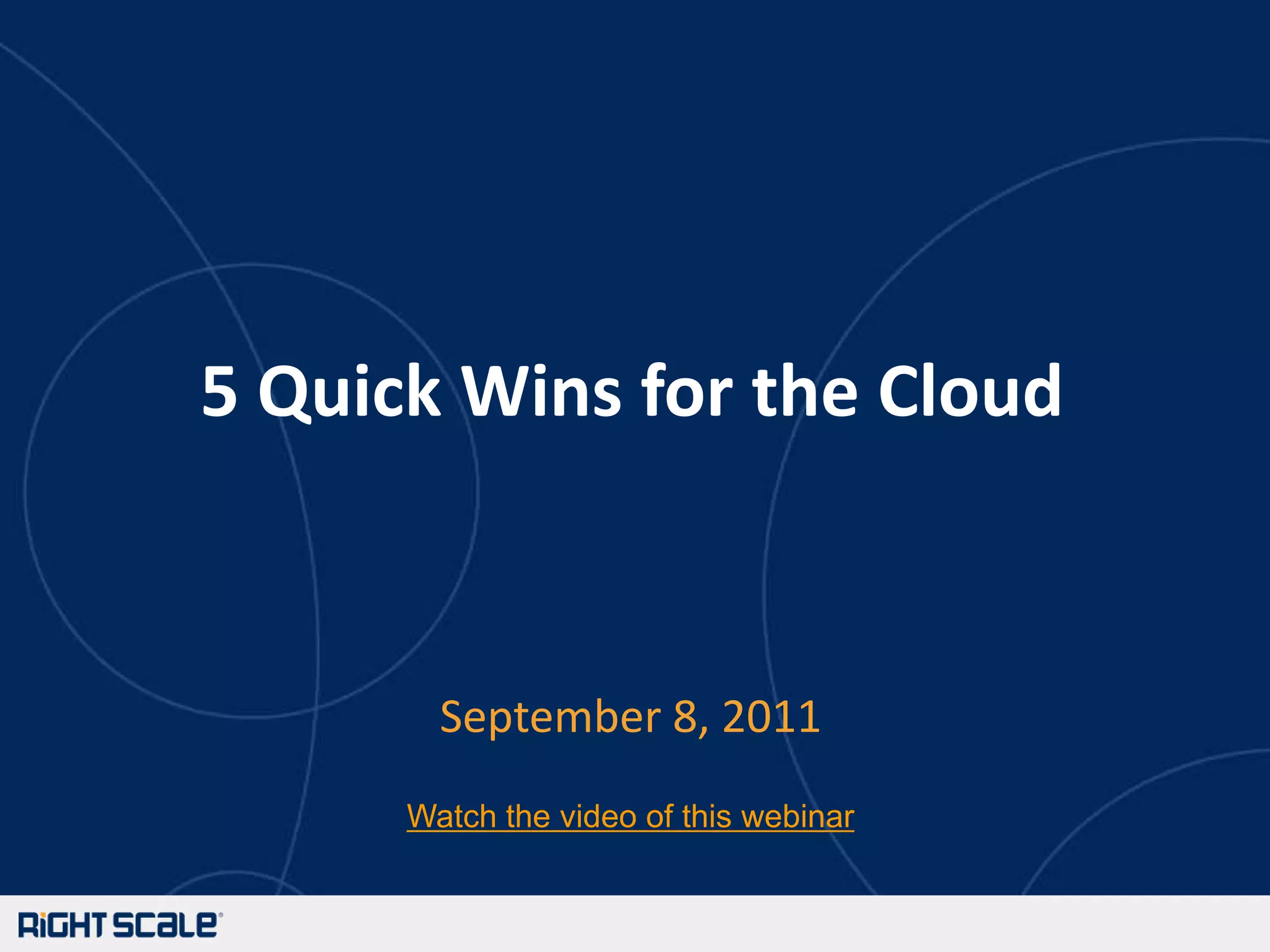 The document outlines five quick wins for leveraging cloud technology, which include moving development and testing to the cloud, implementing configuration automation, enhancing monitoring and alerting, utilizing auto-scaling, and ensuring high availability architectures. Each win presented aims to improve efficiency, reduce costs, and provide scalability for businesses. The presentation also emphasizes the importance of cloud management automation for achieving agility and better resource utilization.