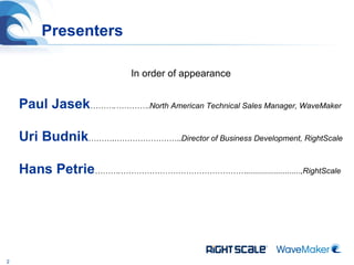 The document summarizes a presentation about developing and deploying scalable cloud applications using WaveMaker and RightScale. WaveMaker is a platform for rapidly developing web and cloud applications while RightScale is a cloud management platform that allows deploying and managing applications across different cloud infrastructures. The presentation included demos of building an application with WaveMaker and deploying/managing it using RightScale's automation and scaling capabilities.