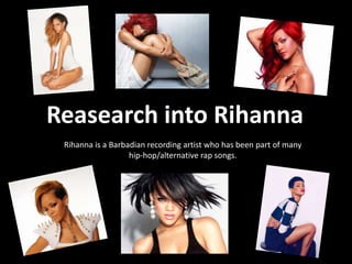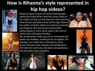 Rihanna's style in her music videos and on her album covers emphasizes sexuality and femininity. She wears tight, revealing outfits in low cuts and shorts that show her chest and legs. Her makeup and dark clothing create sex appeal. On her website and album covers, photos of her are often close-ups that draw the viewer's attention to her physical features, and she poses in flirtatious ways to look attractive and highlight her body. Across her career, Rihanna has cultivated a brand that represents herself as a glamorous and seductive artist.