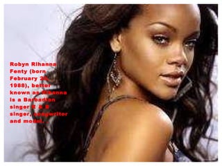 Rihanna is a Barbadian singer and songwriter who moved to the United States at age 16 to pursue a music career. She signed with Def Jam Recordings after singing for Jay-Z. In 2009, her performance at the Grammys was canceled due to an altercation with then-boyfriend Chris Brown, who pleaded guilty to assaulting her. Rihanna has released several successful albums between 2005-2010, including singles that reached number one on the Billboard charts. She has won several awards for her music and serves as an honorary ambassador for Barbados.