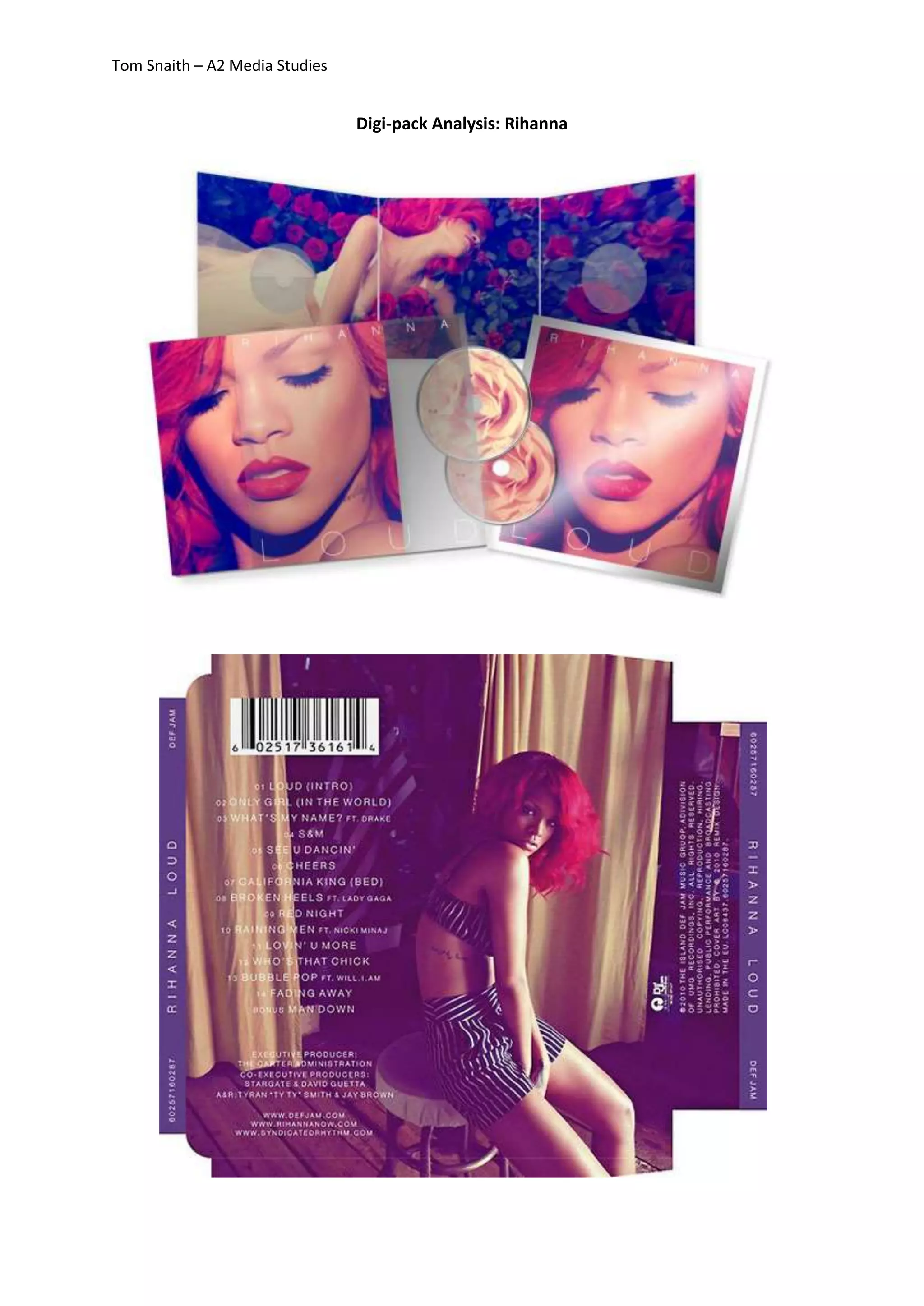 Rihanna's album "Loud" uses provocative imagery and symbolism to portray a narrative of love and desire. The close-up shot of Rihanna's face on the cover suggests sexual tension, while red roses inside represent romance. These conventions apply character, narrative, iconography, setting and technical codes. The bedroom setting among red rose petals also alludes intertextually to the film "American Beauty". Enhanced lighting and colors create a provocative atmosphere that draws attention and encourages sales.