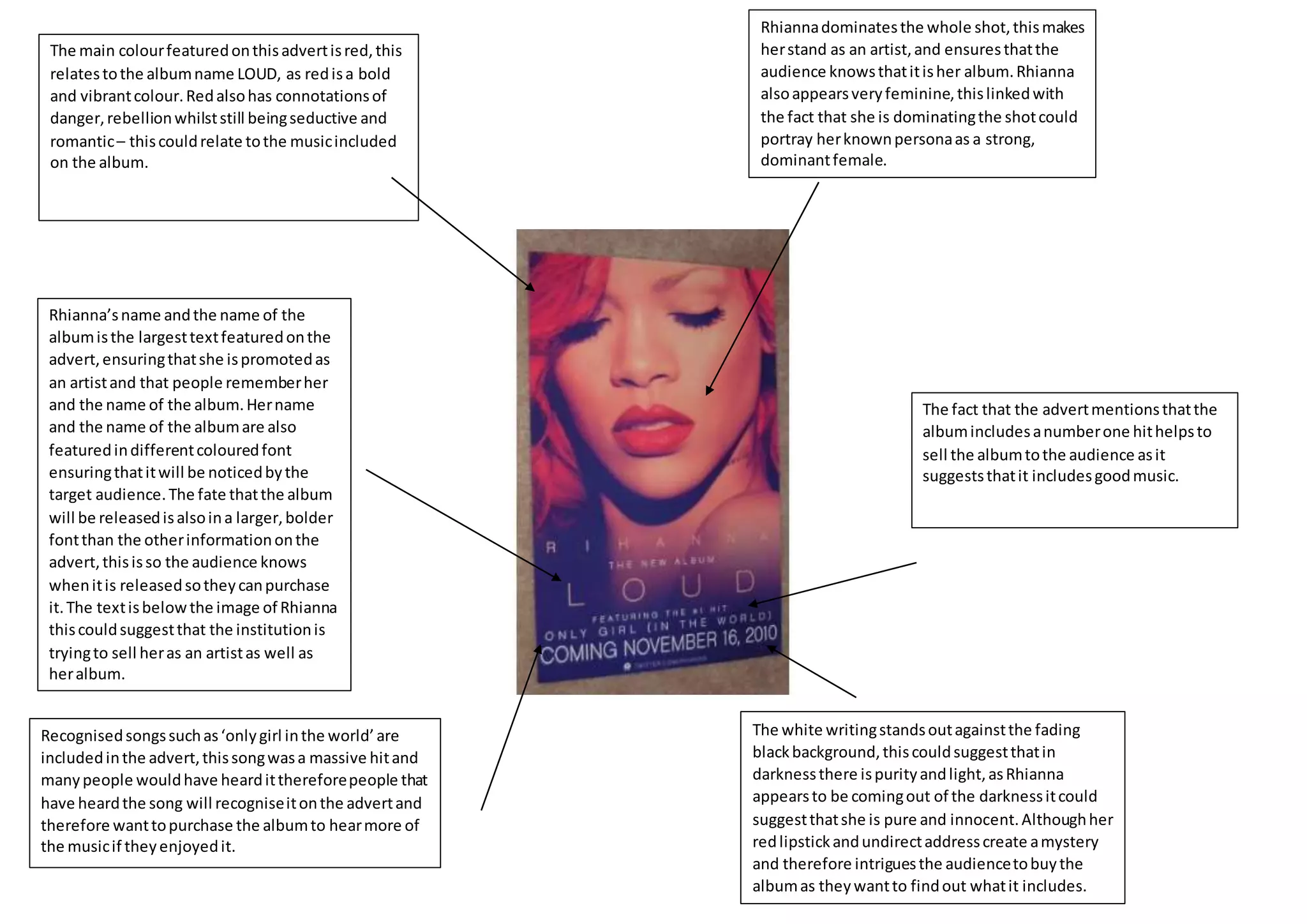The advertisement promotes Rihanna's album "LOUD" through various visual and textual elements. Rihanna dominates the center of the image, presented as a strong, feminine artist. Her name and the album title are prominently displayed in colored fonts to catch attention. Text below indicates the release date so viewers know when to purchase the album. Recognized songs are listed to entice fans of her previous hits to buy the new album. Combined, these elements are intended to sell Rihanna as an artist and promote sales of her new album.