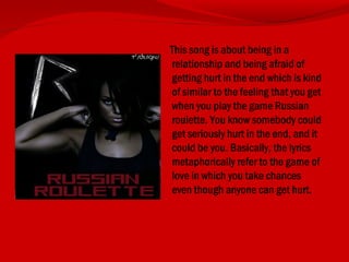 The song compares being in a romantic relationship to playing Russian roulette, where either person could get hurt. The music video depicts Rihanna engaging in risky behaviors and situations that result in her death, metaphorically representing the dangers of love. It uses camera techniques like close-ups, two shots, and flashbacks to convey mood and build suspense. Rihanna wears sexually suggestive clothing and makeup typical of the R&B genre to appeal to fans and sell the video.