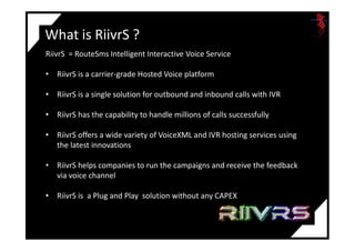 RiivrS is an intelligent interactive voice service platform from RouteSms Solutions that allows for both outbound and inbound calling with IVR capabilities. It can handle millions of calls simultaneously and offers voice and SMS marketing services. RiivrS is a carrier-grade cloud platform that provides automated speech recognition, text-to-speech, and supports multiple languages without requiring any hardware investment.