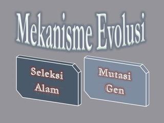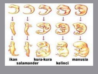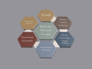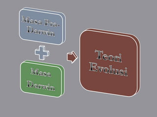 Dokumen ini membahas teori-teori mengenai asal usul kehidupan dan evolusi, termasuk abiogenesis, biogenesis, dan variasi dalam spesies. Ia menjelaskan proses evolusi melalui seleksi alam dan mutasi gen, serta memberikan bukti-bukti seperti fosil, variasi individu, dan perbandingan biokimia. Selain itu, dokumen ini mencakup beberapa teori pra-Darwin dan prinsip-prinsip dasar teori evolusi Darwin.