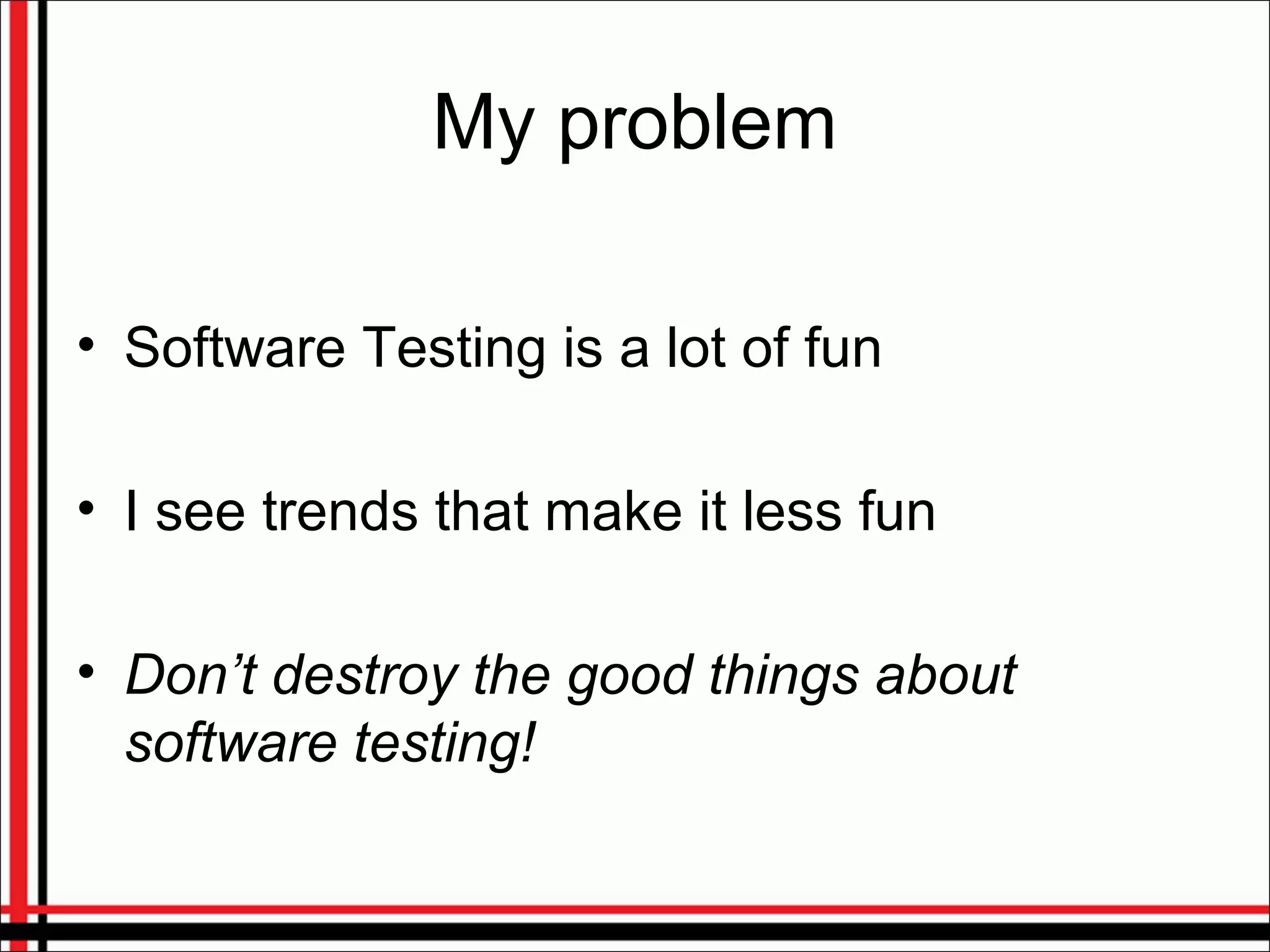 This document summarizes trends in software testing that could diminish its effectiveness and enjoyment. It notes an increasing focus on verification over validation, precise measurement over subjective judgement, and short-term metrics over long-term quality. This narrowing scope risks making testers isolated and limiting their creativity, motivation and ability to consider the full context of a project. The document advocates a holistic and subjective approach that considers people and intangible factors, not just short-term quantifiable results. Subjectivity and considering the whole system, not just parts, are presented as useful for testing.