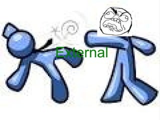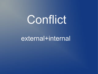 Conflict can be either external between opposing outside forces, or internal within a person between good and bad aspects of themselves. External conflict involves one or many forces fighting against many or one opposing force in an outward fight or struggle. Internal conflict is a fight within a person as their good self struggles against their bad self.