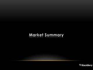Research In Motion (RIM) is a Canadian company known for developing the BlackBerry smartphone. The document discusses RIM's products, market trends showing increasing smartphone usage, a SWOT analysis and competitors. It outlines RIM's marketing objectives to increase awareness, distribution and market share through targeting younger professionals and consumers. Financial projections estimate 10% revenue growth and 55 million devices sold in 2013 with increased marketing expenses. The positioning focuses on BlackBerry providing efficiency for busy professionals.