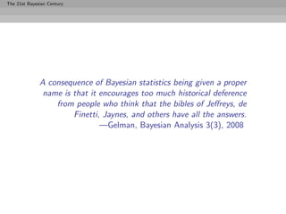 1) The document discusses Bayesian testing and model choice, arguing that the 21st century belongs to Bayesian statistics. 2) It introduces Bayesian tests which are constructed from a decision-theoretic perspective to minimize expected loss. 3) Bayes factors are discussed as a function of posterior probabilities that allows comparison of alternative hypotheses without choosing a prior probability. Bayes factors provide a scale to assess the strength of evidence against a null hypothesis. 4) Issues with improper prior distributions and noninformative priors are addressed, justifying their use in certain situations. Changes to Bayes factors when the null hypothesis has zero prior probability are also described.
