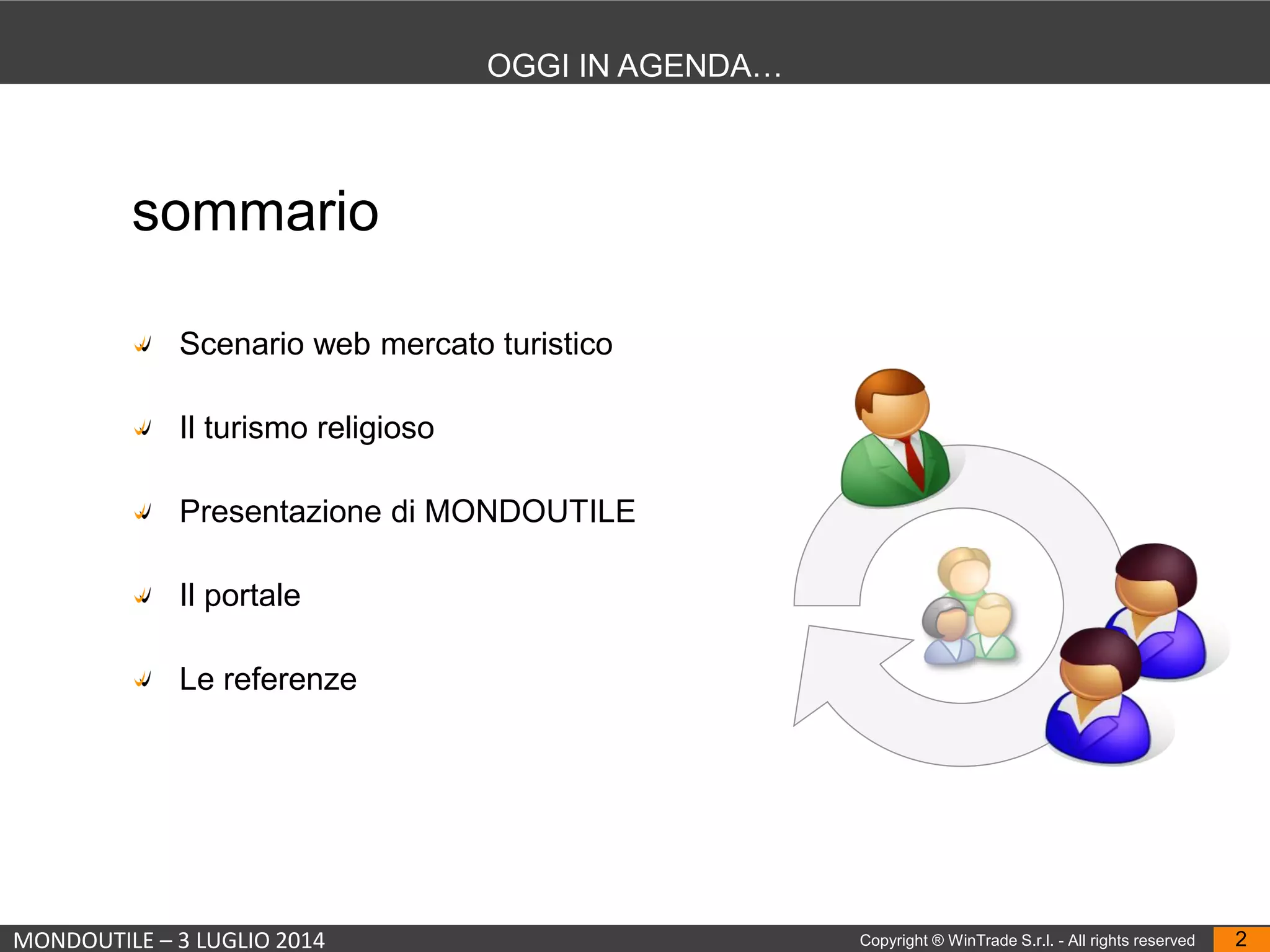 Il documento presenta l'iniziativa Mondoutile, un portale italiano dedicato alle case per ferie, evidenziando l'importanza del turismo religioso che rappresenta il 1,5% del flusso turistico totale in Italia. Vengono analizzati i cambiamenti nei canali di prenotazione, con un incremento dell'uso dei dispositivi mobili e delle influenze delle raccomandazioni online e dei social media sulle decisioni di viaggio. Si sottolinea anche il valore culturale e sostenibile del turismo religioso, con una spesa media pro capite di 51 euro al giorno.