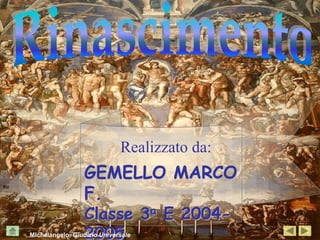 Il documento tratta del Rinascimento, un periodo artistico dal XV al XVI secolo, caratterizzato dal ritorno alle forme classiche e dall'innovazione nelle tecniche artistiche come la prospettiva lineare. Artisti come Michelangelo, Leonardo da Vinci e Raffaello hanno contribuito significativamente all'arte e all'architettura, introducendo nuove correnti e modelli che hanno influenzato le generazioni successive. La fine del Rinascimento ha visto una transizione verso il Manierismo, in seguito a eventi storici come il sacco di Roma del 1527.