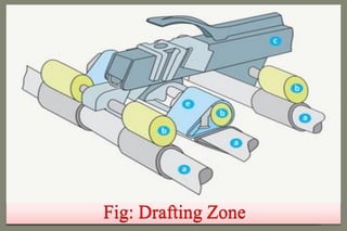 This document presents information about ring spinning. Md. Yousuf Hossain from Green University of Bangladesh introduces the topic and defines key terms like fiber, spinning and yarn. It then describes the ring spinning process which involves blow room, carding, draw frame and speed frame before the roving reaches the ring frame. Here, it is drafted and twisted to produce yarn, which is then wound onto bobbins. The document focuses on the drafting zone of the ring frame and explains how higher drafts are applied. It also provides details about how the yarn travels through the traveller and onto the cop during winding. In closing, advantages and limitations of ring spinning are mentioned.