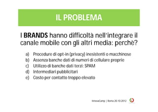 Il documento presenta ring2us, un sistema di mobile marketing progettato per aiutare i brand a integrare il canale mobile con altri media, affrontando problematiche di privacy e assenza di banche dati. Offre un processo di acquisizione e fidelizzazione di contatti gratuito e sostenibile, e il mercato potenziale include 4,3 miliardi di utenti di telefoni cellulari. Il modello di business prevede costi legati ai contatti e campagne di marketing, con fondi richiesti per lo sviluppo della piattaforma tecnologica e marketing.