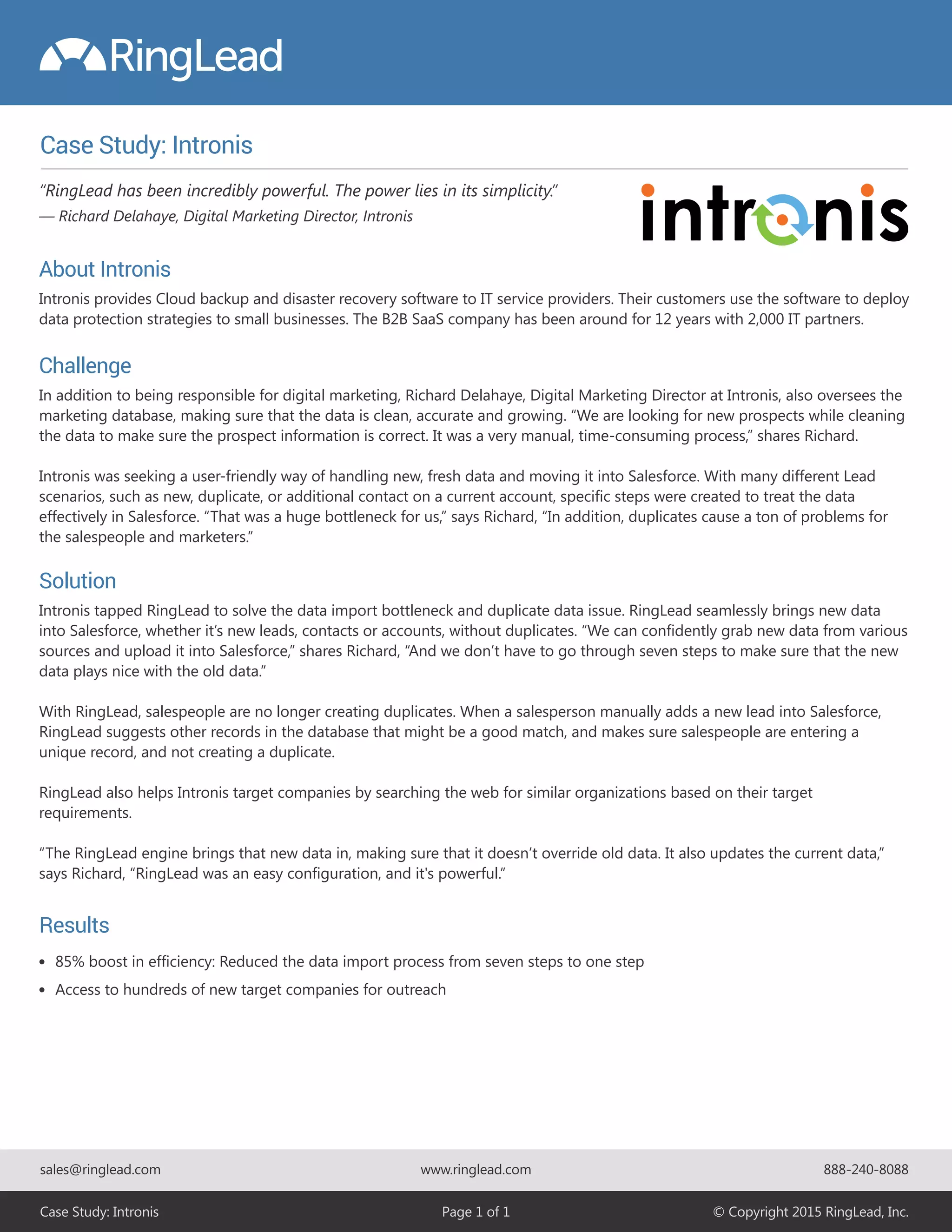 Intronis, a B2B SaaS company, improved its data import efficiency by 85% by utilizing Ringlead, which streamlined their processes from seven steps to one. This integration allowed for the seamless import of new data into Salesforce while preventing duplicates, thereby enhancing the accuracy and effectiveness of their marketing efforts. Richard Delahaye, the digital marketing director at Intronis, highlighted the significant reduction in manual workload and improved targeting of new prospects as key benefits of the solution.