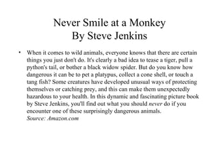 The document contains summaries of several children's books about animals, nature, and science. It discusses books about dangerous animals and what not to do around them, animal body parts and adaptations, animal life cycles and growth, the biggest and smallest animals, how animals catch food and survive, and how colorful animal patterns help them live. The document provides summaries of classroom activities teachers could do with students after reading each book aloud. The activities involve discussing the books, drawing pictures, acting out animals, writing facts, and more.