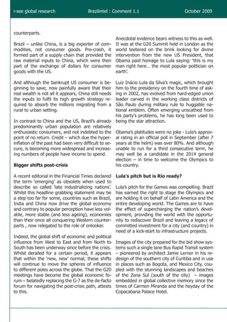 Brazil is positioning itself as a significant player on the global stage by hosting the 2016 Olympics, aiming to shed its 'emerging' status and project an image of economic stability and progress. Although Rio de Janeiro faces challenges similar to those of past hosts, leveraging the games could facilitate infrastructure improvements and attract international business. The success of Lula's administration in managing economic growth and social programs underpins this ambition, presenting a transformative opportunity for the nation.