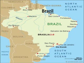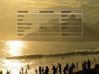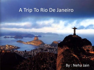 Rio de Janeiro is known for its natural beauty, beaches like Copacabana and Ipanema, carnival celebrations, and large urban forest. Portuguese is the main language, but Spanish and English are also used. The climate is warm and humid in the summer and mild in the winter. The document provides an itinerary for a 6-day trip to Rio de Janeiro that includes visits to popular destinations like Sugarloaf Mountain, Botanical Gardens, Tijuca Forest, and schedules flights from and back to Delhi, India.
