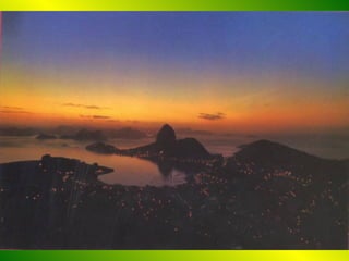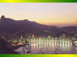 Rio de Janeiro is known as the "City of God" due to its natural beauty including mountains, beaches and the iconic statue of Christ overlooking the city. The climate is warm and dry but with enough rain to avoid drought. Locals, called Cariocas, have a reputation for being fun-loving and relaxed. The document discusses the contrasts between wealth and poverty in Rio, noting that the wealthy live in luxury apartments while the poor live in favelas, or hillside slums, with over 100,000 people living in just one favela called Rocinha. It also profiles two hypothetical Cariocas with very different lifestyles.