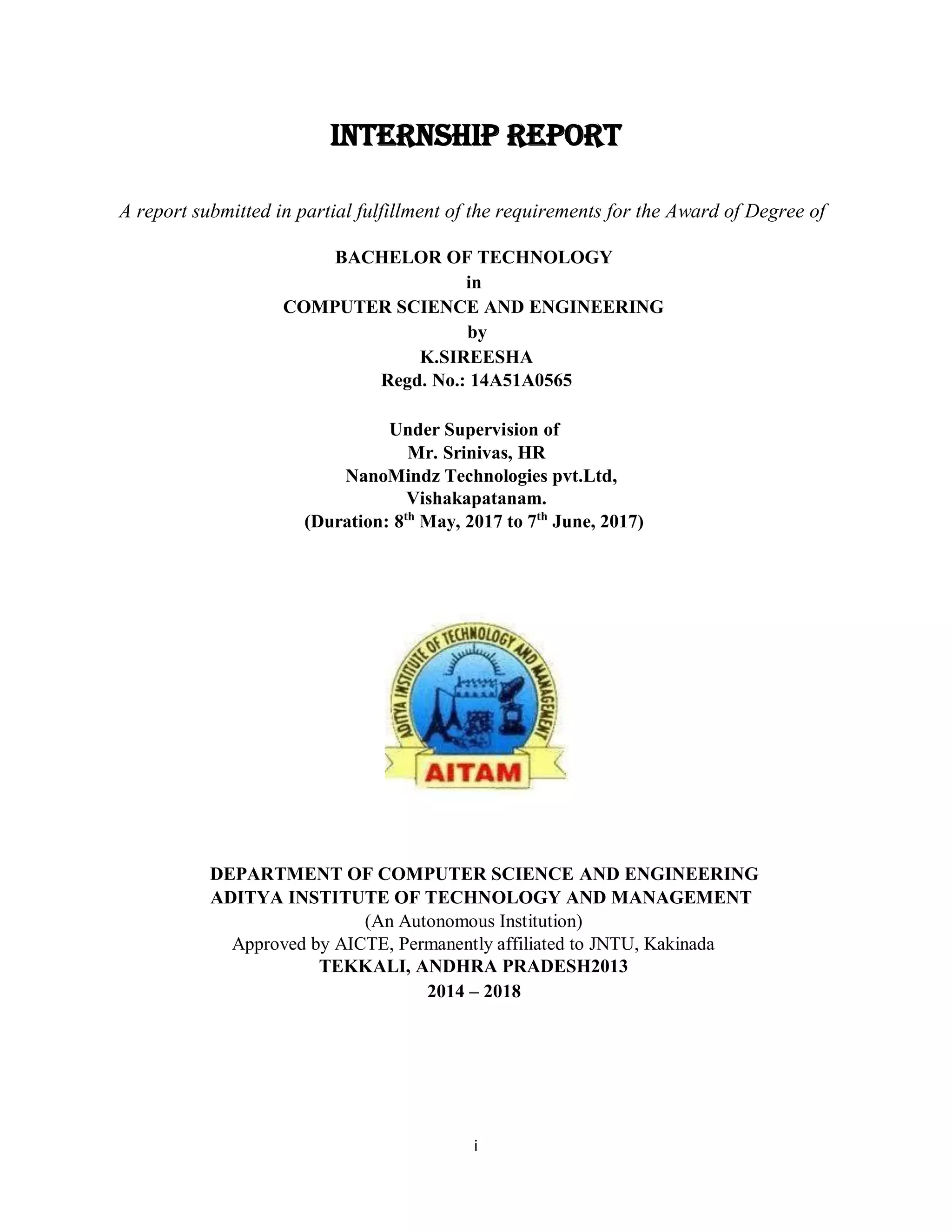 This document summarizes an internship report submitted by K. Sireesha at NanoMindz Technologies Pvt. Ltd. from May 8th to June 7th 2017. The report includes an introduction to the company, which focuses on software development, website design, and geographic information services. It also describes the learning objectives of the internship, which were to gain experience in .NET framework, C#, databases, and web development. The bulk of the report consists of a weekly log of topics covered, including ASP.NET, HTML, controls, and a final project involving design, coding, and testing.